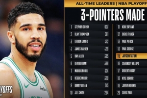 本场比赛前,塔图姆生涯季后赛三分命中数为264个,排名NBA历史第16位。