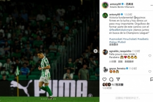 安东尼社媒晒出自己的赛场照片,配文:“一场关键的胜利,我们在竞争中继续稳步前进,今天迈出了非常重要的一步。很骄傲在贝蒂斯参与这段征程,让我们一起为欧冠资格而战!”