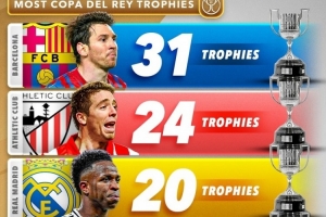 体育资讯4月26日讯 北京时间明天凌晨,巴萨和皇马将在国王杯决赛中展开较量。Score90排出了国王杯夺冠次数榜单,巴萨31冠居首,皇马20冠排名第三位。