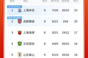 体育资讯04月26日讯 中超第9轮今日结束多场争夺,蓉城2-1亚泰,英博1-1新鹏城,申花1-0泰山,最新中超积分榜如图。