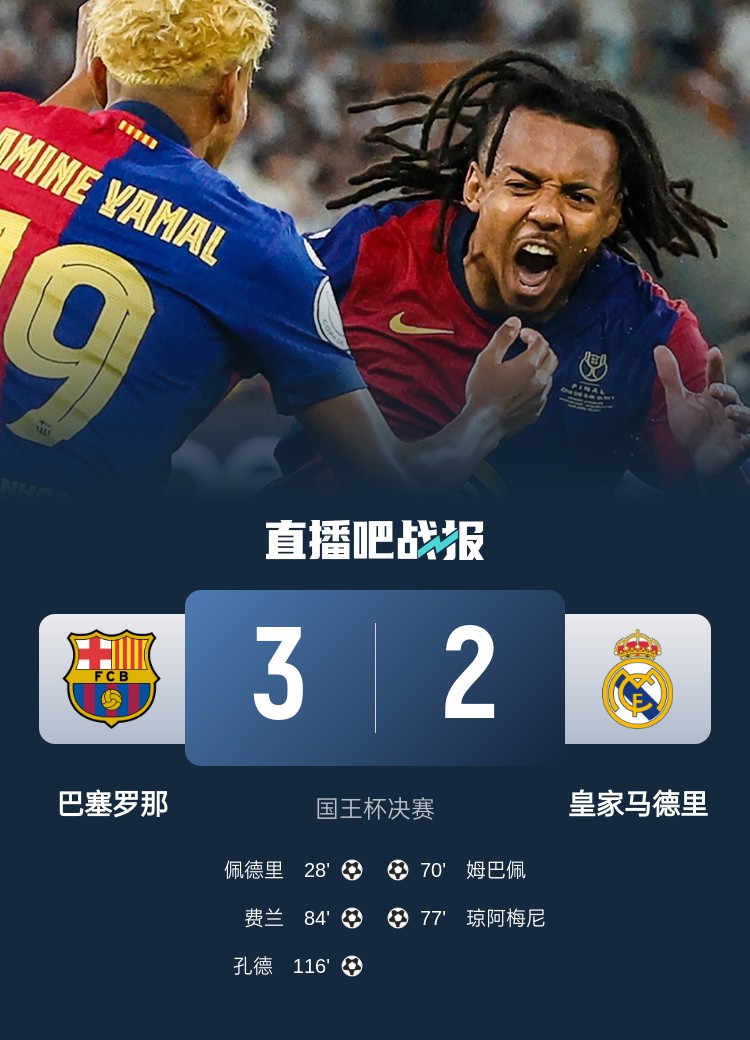 体育资讯4月27日讯 在国王杯决赛,巴萨经历加时3-2击败皇马。