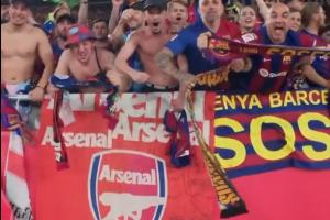 ESPN晒图:巴萨球迷在国王杯决赛击败皇马后,展示了一面阿森纳的旗帜👀