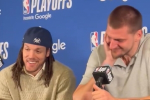 赛后,掘金球星阿隆-戈登和约基奇出席了新闻发布会。对于约基奇三分不进自己补扣绝杀那球,戈登打趣约基奇:“传得漂亮。Airballs(三不沾)真的很难防守。”