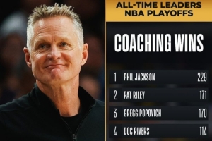 本场获胜后,科尔季后赛执教胜场数来到101胜,超越拉里-布朗(100),来到历史第6位!