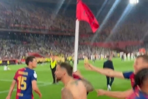 巴萨夺冠之后,伊尼戈-马丁内斯举起角球旗庆祝,巴萨官方社媒晒出视频,配文:“那面旗帜是伊尼戈的,不属于其他任何人。”