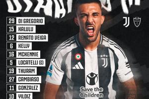 尤文首发:29-迪格雷戈里奥、15-卡卢卢、12-维加、6-凯利、16-麦肯尼、5-洛卡特利、19-K-图拉姆、27-坎比亚索、11-贡萨雷斯、10-伊尔迪兹、20-穆阿尼