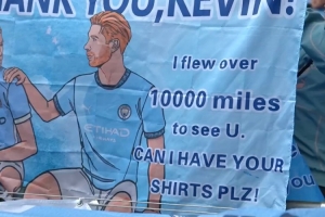 体育资讯4月27日讯 今晚11点30分,足总杯半决赛,曼城对阵诺丁汉森林。赛前,有球迷在场边拉上德布劳内的海报和标语,非常抢眼。