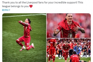 努涅斯配文写道:“梦想成真:这是我生涯第一个英超冠军。感谢所有利物浦球迷的鼎力支持!联赛冠军属于你们!”