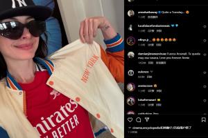 赛前,好莱坞著名女星安妮-海瑟薇更新社媒,为阿森纳加油打气,她晒出身穿阿森纳球衣的照片,配文:特别的周二😍