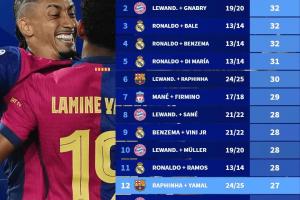 欧冠单赛季进球+助攻最多组合:法老+菲米居首,C罗莱万多次在榜