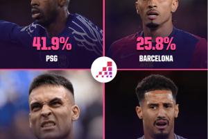 巴黎以41.9%成为夺冠最大热门,巴萨25.8%第二,国米20.2%,阿森纳12.1%。