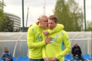 哈兰德搂着德布劳内亲了一口,然后非常开心地跑开。