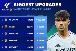 体育资讯3月24日讯 《转会市场》统计了西甲球员身价更新后的升值最多情况,劳尔-阿森西奥力压佩德里居首。