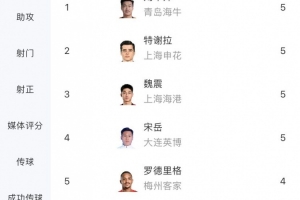 中超黄牌榜:特谢拉、魏震、刘军帅、宋岳5黄,王上源、黄嘉辉4黄