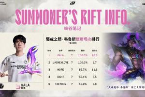 体育资讯5月3日讯 LPL登峰组TES交手iG首局落败,而第一局TES选出韦鲁斯,至此LPL第二阶段仅剩GALA的韦鲁斯胜利保持100%。