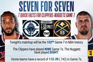 据NBA官方统计,本场比赛将是NBA历史上第152场抢七大战,快船队此前参加过9次抢七,掘金队则为8次。