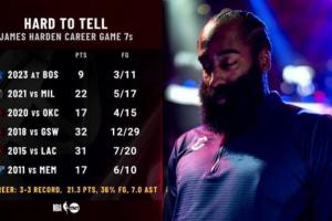 把今天比赛算上,哈登生涯至今一共7次抢七,有4次命中率低于30%、5次命中率低于40%、只有1次命中率高于50%。