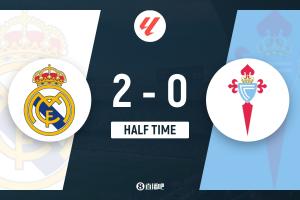 上半场比赛结束,皇家马德里主场暂时2-0领先塞尔塔。