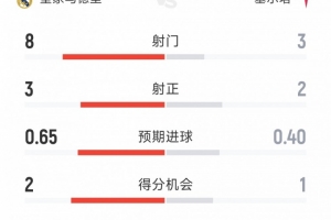 体育资讯5月4日讯 本轮西甲皇马对阵塞尔塔上半场结束,皇马暂时2-0领先,以下为双方半场数据对比: