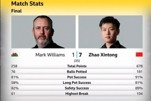 长台成功率 赵心童81%-58%马克-威廉姆斯