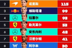 本站过后,车手积分榜方面,两位迈凯伦车手皮亚斯特里和诺里斯排名车手积分榜前2,其中皮亚斯特里131分领跑,诺里斯115分排名次席,维斯塔潘、拉塞尔、勒克莱尔位列车手积分榜3-5名。6-10名的车手是安东内利、汉密尔顿、阿尔本、奥康、斯托尔。