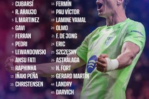 2-库巴西、4-阿劳霍、5-伊尼戈-马丁内斯、6-加维、7-费兰-托雷斯、8-佩德里、9-莱万、10-法蒂、11-拉菲尼亚、13-佩尼亚、15-克里斯滕森、16-费尔明、18-保-维克托、19-亚马尔、20-奥尔莫、21-德容、24-埃里克-加西亚、25-什琴斯尼、26-阿斯特拉拉加、32-赫克托-福特、35-杰拉德-马丁、44-兰德里-法雷、45-达维奇