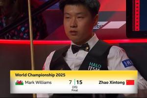 第三阶段上半场战罢,赵心童以14-7的比分领先威廉姆斯。下半场回来,赵心童再下一局,15-7领先威廉姆斯!