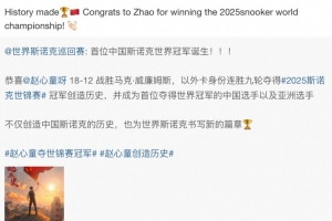 澳大利亚名将尼尔-罗伯逊在微博转发了赵心童夺冠的报道,并配文写道:“创造历史🇨🇳祝贺赵心童夺得2025斯诺克世锦赛冠军!”