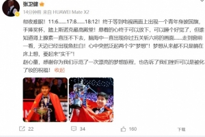 张卫健写道:彻夜难眠!11:6……17:8……18:12!终于等到电视画面上出现一个青年身披国旗,手捧奖杯,踏上斯诺克最高殿堂!悬着的心终于可以放下,可以睡个好觉了,但谁知道肾上腺素一直压不下去,脑海中一直出现你过五关斩六将的画面……走到窗前一看,天边已经出现鱼肚白!心中突然泛起两个字“梦想”!梦想从来都不只是躺在床上想,要起来“实干”!赵心童,感谢你为我们示范了一次漂亮的梦想旅程,也告诉了我们挫折可以是被化了妆的祝福!