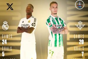贝蒂斯社媒为图片配文:自从GOAT加盟贝蒂斯以来,维尼修斯与安东尼的数据对比👀在我看来金球奖竞争者只有一个🐐🏆