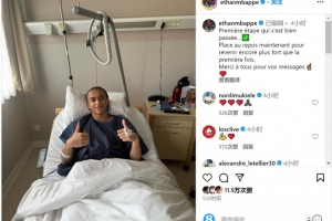 伊桑社媒晒自己躺在病床上竖拇指的照片,并写道:“第一步顺利完成,现在是休养时间,然后以更强大的姿态回归,感谢大家的祝福留言。”