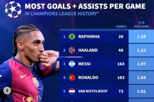 体育资讯5月7日讯 德国转会市场统计了球员在欧冠场均参与进球的数量,并列出历史排名,拉菲尼亚1.19球居首,哈兰德、梅西、C罗前四。