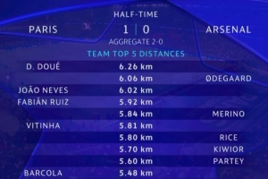 巴黎边锋杜埃是两队半场跑动最多的球员,跑动距离6.26km。