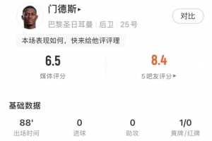 巴黎左后卫努诺-门德斯比赛第88分钟被替换下场,球员此役数据如下: