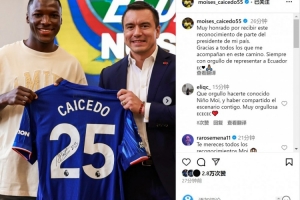 凯塞多社媒晒出与诺沃亚的合照,配文:“非常荣幸能够从我国总统那里获得这样的认可,感谢所有陪伴我走过这段旅程的人。始终以代表厄瓜多尔为荣。”