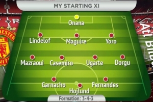 曼晚预测曼联首发:奥纳纳;林德洛夫、马奎尔、约罗;马兹拉维、卡塞米罗、乌加特、多古;加纳乔、B费、霍伊伦