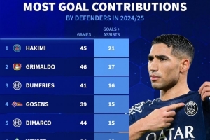 体育资讯5月8日讯 德国转会市场统计了本赛季五大联赛后卫的参与进球数量,并列出榜单,阿什拉夫21球居首,格里马尔多、邓弗里斯排名二三位。