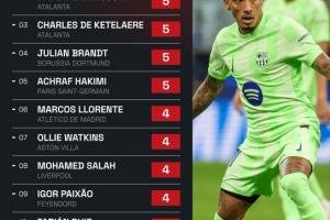 本赛季欧冠助攻王:拉菲尼亚8次居首,阿什拉夫5次共4人并列第二