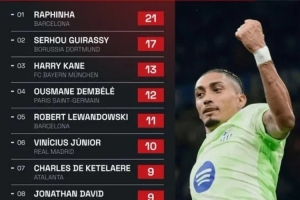 体育资讯5月9日讯 欧冠半决赛战罢,媒体统计了本赛季欧冠参与进球数榜单↓