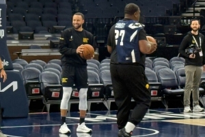训练中,库里只是站在篮下陪队友训练,自己没有参与训练。