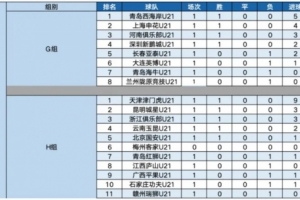 体育资讯5月9日讯 U21联赛预赛第一阶段第1轮过后,两支大胜对手的球队青岛西海岸U21、天津津门虎U21分别排在G组和H组榜首,射手榜(含此前小组赛阶段)上申花U21球员庞开元以7球排名榜首。