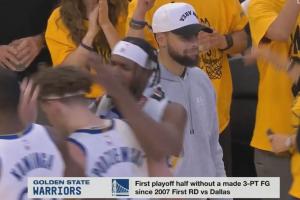 勇士上半场比赛三分5投0中,上次勇士季后赛半场无三分进账已是18年前,2007年首轮对阵达拉斯小牛(现独行侠),G2下半场勇士三分4中0。
