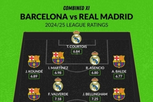 WhoScored根据球员本赛季西甲的场均评分列出国家德比阵容,莱万、姆巴佩、亚马尔、贝林厄姆在列。