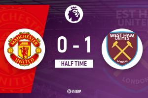 上半场伤停补时2分钟,半场结束,曼联暂0-1西汉姆。