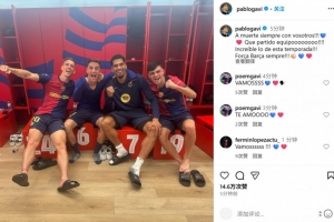 本场比赛加维替补登场,赛后他也在个人社媒晒出与队友阿劳霍、奥尔莫以及佩德里的庆祝合影,配文写道:“至死都与你们在一起,多棒的团队,本赛季简直不可思议!巴萨加油!”