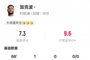 体育资讯5月12日讯 英超第36轮,利物浦主场迎战阿森纳,加克波首发出战,贡献1粒进球,送出1次关键传球,还有1次抢断,评分7.3。
