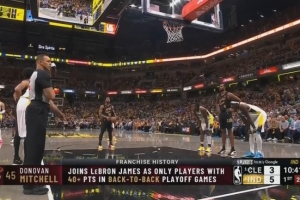 米切尔罚球,现场给出字幕:连续季后赛两场都砍下40+,队史仅有他和詹姆斯做到