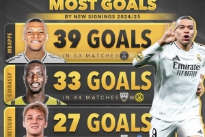 体育资讯5月13日讯 媒体统计了本赛季五大联赛新援进球数量,并列出榜单,姆巴佩39球居首,吉拉西33球次席。
