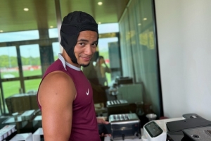 体育资讯5月13日讯 据海港新闻官赵昊晨透露,今天一早蒋光太偷偷试戴了吾米提江的护具头盔。