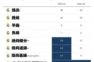 对比本赛季和上赛季皇马西甲联赛数据